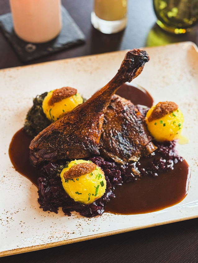- Gänsebrust und -keule - außen knusprig, innen butterzart, begleitet von duftendem Rotkohl, fluffigen Kartoffelklößen und einer fruchtigen Orangensoße, die die Aromen perfekt ausbalanciert.