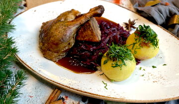 Festive Evening Buffet Whether it’s duck leg with red cabbage, venison stew with buttered spätzle, pan-fried trout or our vegetarian root vegetable and potato strudel - there’s something for everyone. And for dessert: festive treats like curd dumplings and apple-speculoos trifle.