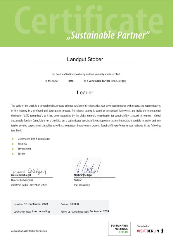 Clean air - clean water - clean audit result: the climate-positive Stober estate, embedded in nature and on the lake, right on the city limits of Berlin, was recognized in the internationally recognized, independent and transparent SUSTAINABLE MEETINGS BERLIN audit in the hotel sector certified as LEADER with a 91% result. The audit criteria catalog is based on recognized frameworks and holds the international “GSTC recognized” award because it was recognized by the global umbrella organization for sustainability standards in tourism - Global Sustainable Tourism Council.