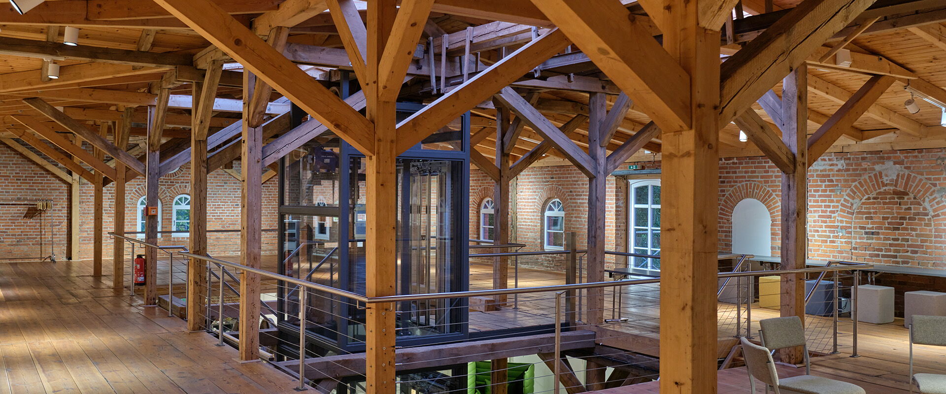 Die Kreativgalerie befindet sich im Galeriegeschoss des ersten Obergeschoss des Kornspeichers. Eine luftige, leicht wirkende Holztragekonstruktion mit den wärmespendenden Ziegelwänden prägen diesen außergewöhnlichen Veranstaltungsraum unter dem Dach. Vier riesige Oberlichter und viele kleine Fenster geben dem Raum das nötige Tageslicht. Ein teils historischer Holzdielenboden, vorhandene Metallschütten unter der Decke und Holzkanäle für die früher mechanisiert ablaufende stete Umlagerung des Korns lassen dennoch allen Freiraum für eigene Kreativität.