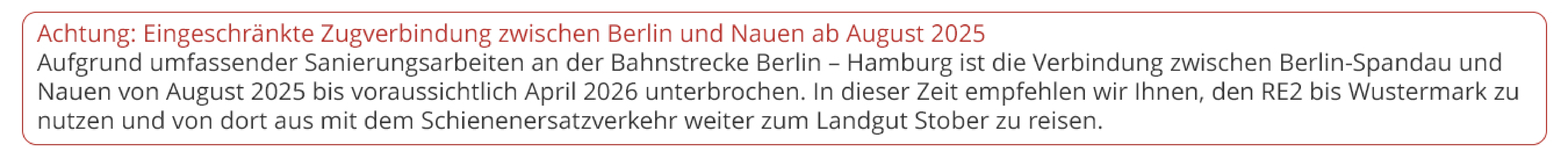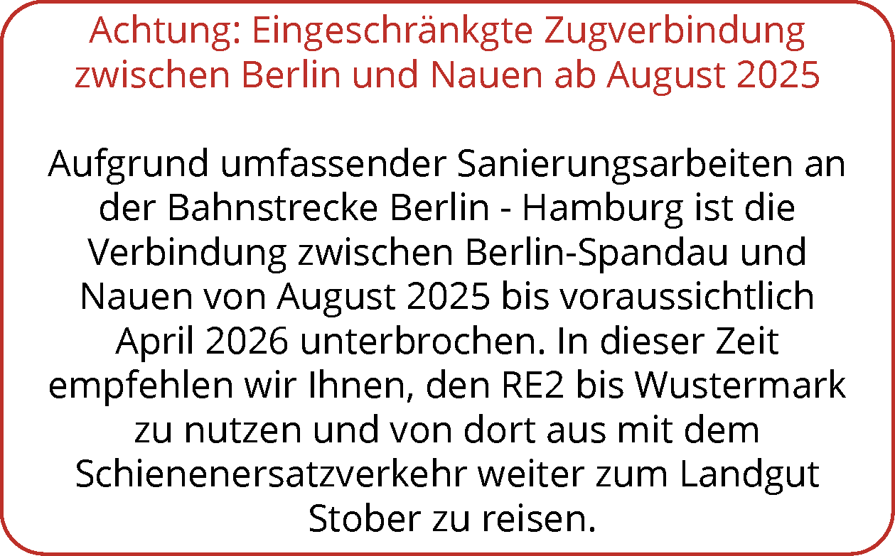 - ca. 35 min vom Berliner Hauptbahnhof bis Bahnhof Nauen (RE4) - von dort ca. 15 min mit Bus 660 oder Taxi (Vorbestellung empfohlen) zum Landgut Stober
