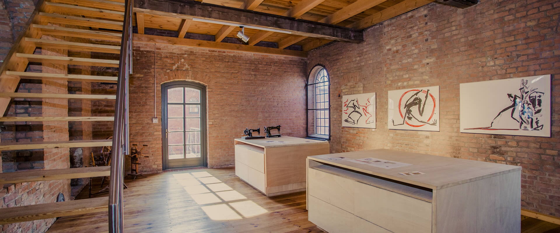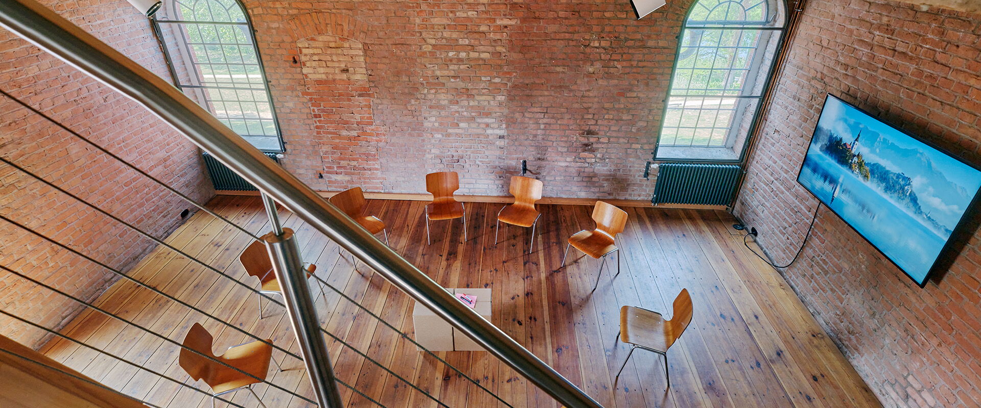 This small salon impresses with its location on the 2nd floor of the Brennerei building, directly next to/above the historic Borsig steam engine "Dicke Bertha" with its 8-metre-high engine room. Wooden floorboards, solid red brick walls, steel windows with glazing bars and a massive wooden beamed ceiling reduce your meeting to the essentials.