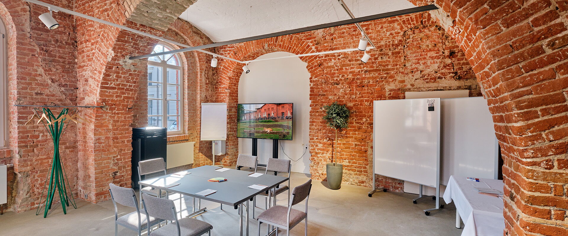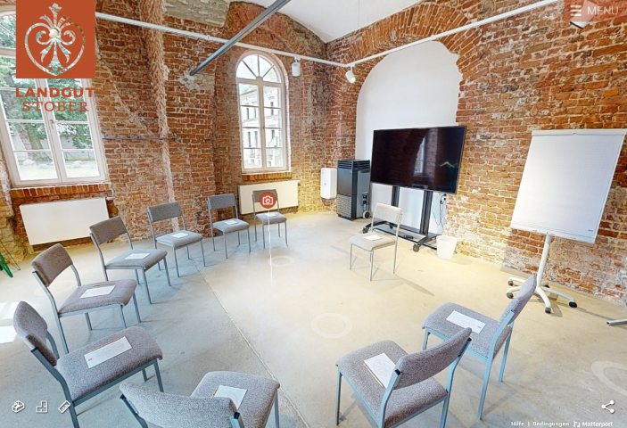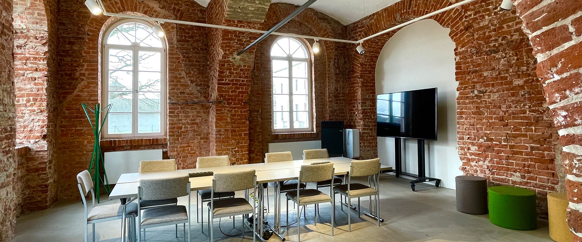 The Salon Stella is located on the ground floor of the Kornspeicher building and has its own warm charm thanks to the red brick walls and very large mullioned windows with round arches. This contrasts with the waxed concrete screed and the ultra-modern lighting system. Two large brick arches round off the rustic yet modern ambience. If your gaze does wander outside, it will fall on a 400-year-old olive tree and a 500-year-old oak tree and the former highly representative gate of the Landgut. Perfect for smaller meetings.