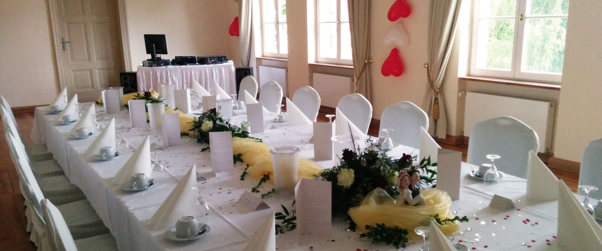 Der Salon Anna im ersten Obergeschoss des Gutsverwalterhauses bietet mit seinen 58 m² den perfekten Rahmen für eine stilvolle Hochzeit im kleinen Kreis. Ob für ein intimes Hochzeitsdinner oder eine exklusive Feier – hier genießt ihr eine warme und elegante Atmosphäre. Historische Kristalllüster, vergoldete Wandleuchten und der ursprüngliche Dielenboden verleihen dem Raum einen ganz besonderen Charme.