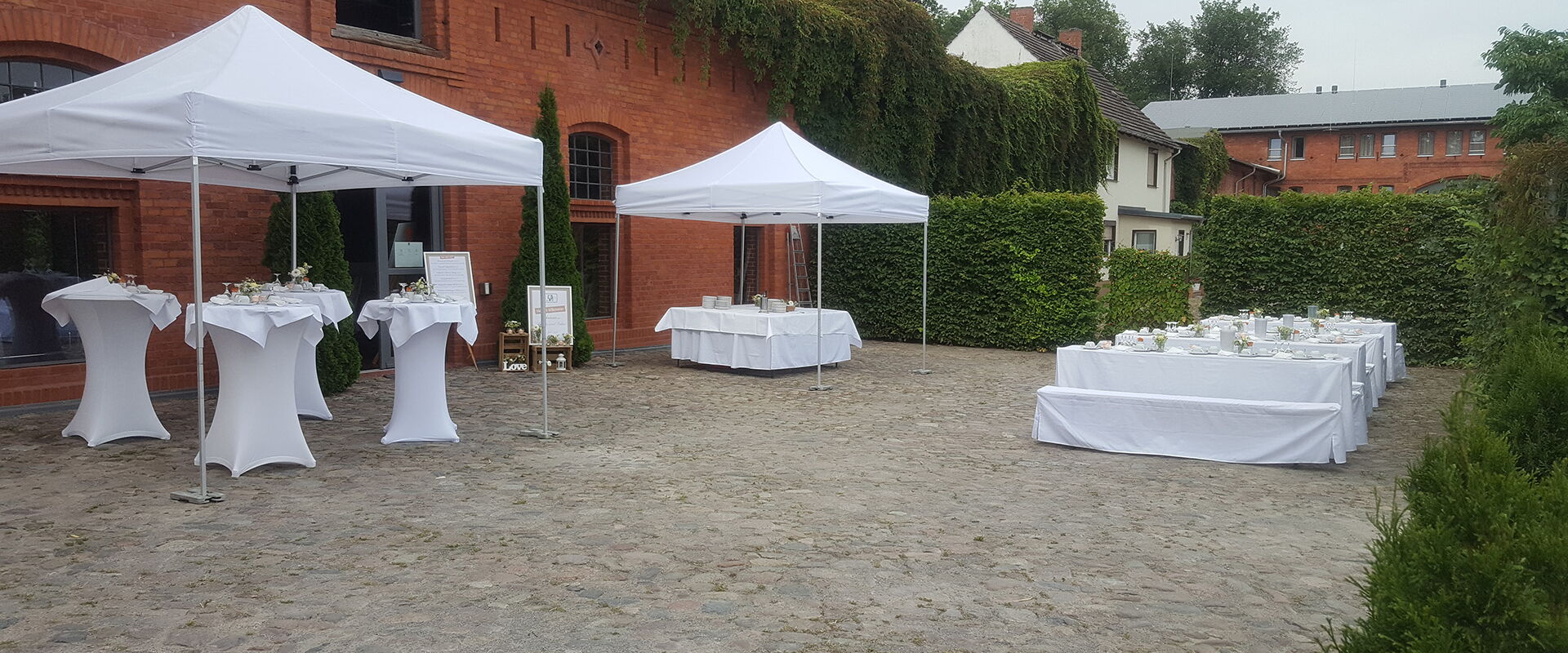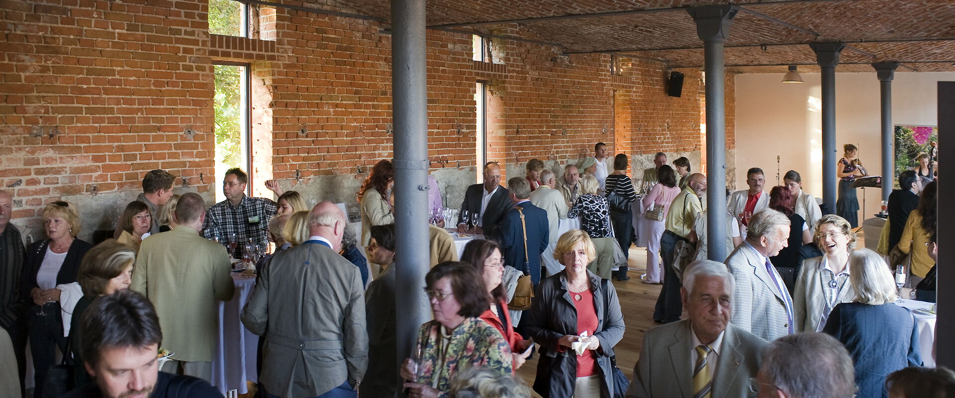Located on the ground floor of the Kälberstall building, the Salon Luise captivates with its minimalist beauty. The unique ambience is created with floorboards, brick walls and vaulted ceilings, steel columns and a view of the lake. A loudspeaker system with microphones and a ventilation system are installed in this salon. There is an open space in front of the salon that can be furnished with pavilions, for example.